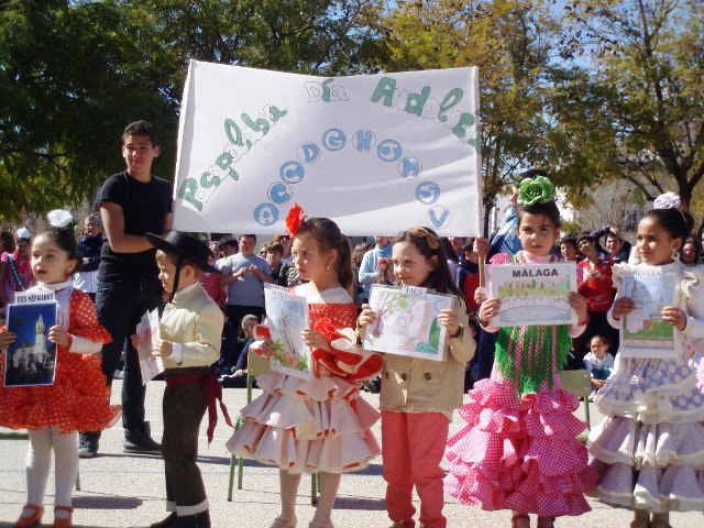 - Reparto de pegatinas de la bandera de Andalucía a cargo de los alumnos/as del primer ciclo de Primaria ataviados con el traje regional.