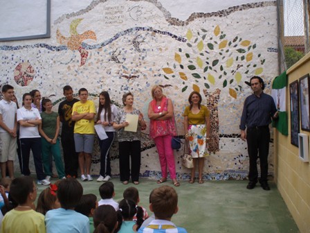 La Delegada de Educación, Dª Mª Antonia Naharro Cardeñosa, junto a la comunidad educativa del colegio concertado María Zambrano inauguró el mosaico realizado por dos promociones de alumnos de 4º de ESO con la colaboración del resto de cursos del colegio. Se comenzó a principios del curso pasado y se ha finalizado en junio de este año.